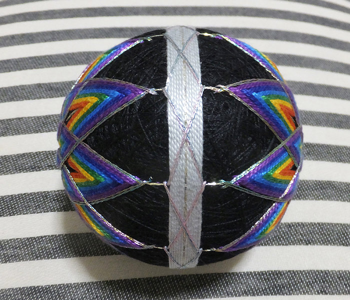 こちらが出来上がった虹色の手鞠。黒ベースの既製品の土台を使いました。