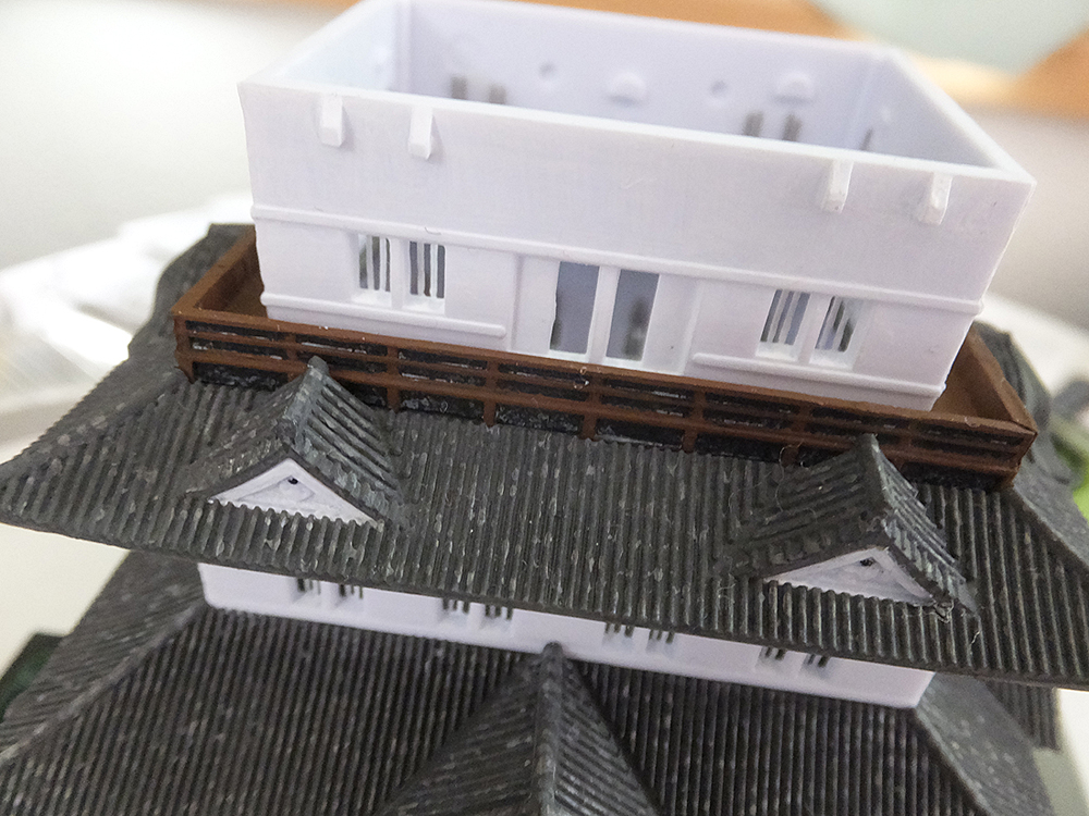 壁と屋根を仕上げた後は、天守最上階の欄干を塗りました。